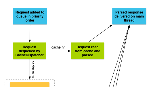 当你执行add()方法时,Volley触发执行一个缓存处理线程以及一系列网络处理线程。当你添加一个请求到队列中,它将被缓存线程所捕获并触发:如果这个请求可以被缓存处理,那么会在缓存线程中执行响应数据的解析并返回到主线程。如果请求不能被缓存所处理,它会被放到网络队列中。网络线程池中的第一个可用的网络线程会从队列中获取到这个请求并执行HTTP操作,解析工作线程的响应数据,把数据写到缓存中并把解析之后的数据返回到主线程。