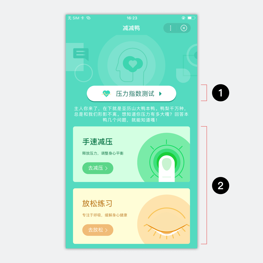 - 明确层次:压力指数测试功能入口使用强化按钮展示(1)。按钮嵌入在插画头图中,高明度的配色使按钮与背景对比鲜明,层次清晰;