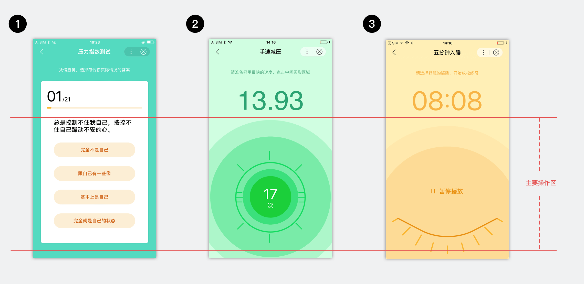 - 充分传达:手速减压与放松练习两创新功能入口,使用面积较大的卡片展示(2),以承载功能介绍文案及配图。