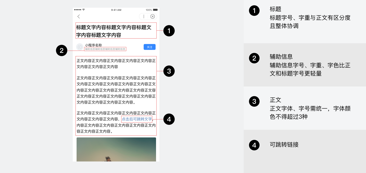 使用注意:标题、辅助信息、正文、可跳转链接,应使用不同的字号、字重和字色,拉开层次