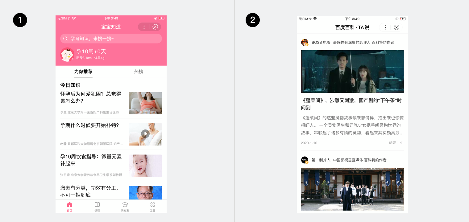 示例:百度文库(1)、百度知道(2)的页面标题、正文字号、字重有明确区分,阅读体验好。