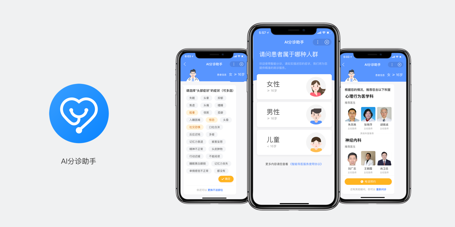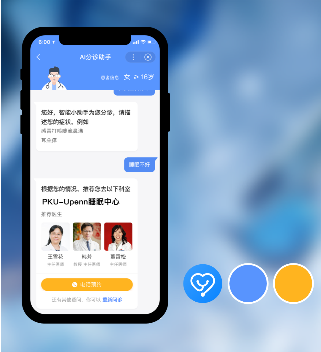 以蓝色作为AI分诊小程序的主色,给用户安全可信赖的感受,蓝色对比色橙色凸显重要按钮信息。