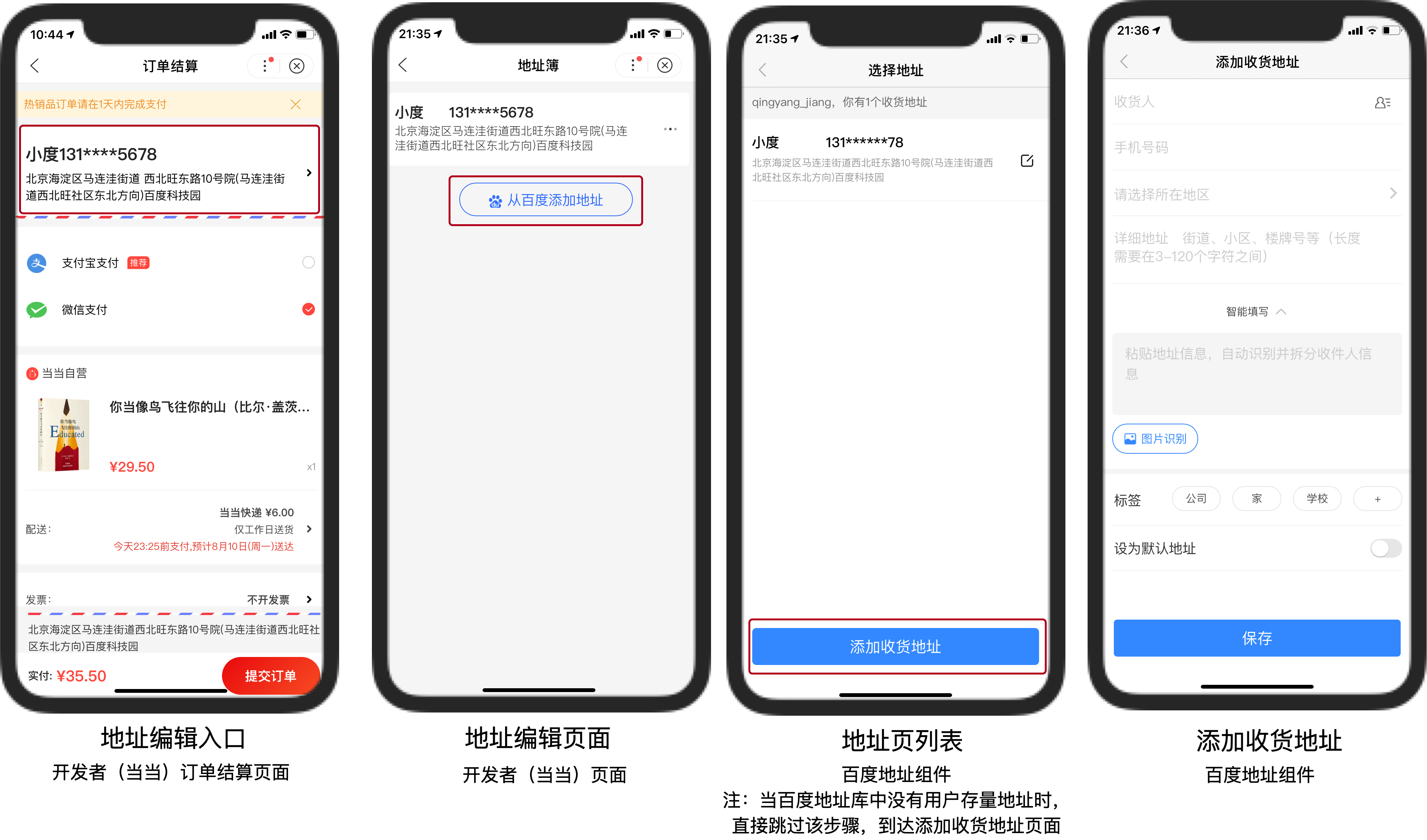 注:建议开发者在小程序内地址管理页面采用如上交互,在百度地址库中添加的地址会同步在开发者的地址库中。