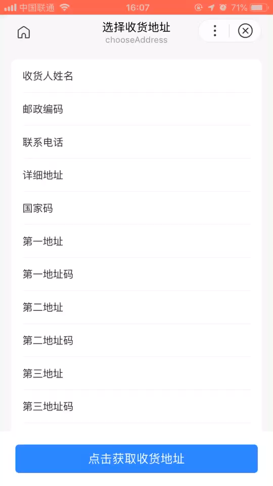 <button type="primary" bindtap="chooseAddress">点击获取收货地址</button>