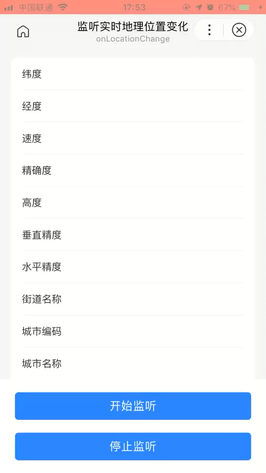 - tip:该方法会持续监听地理位置信息的变化,建议在不需要监听地理位置信息变化后,直接调用
