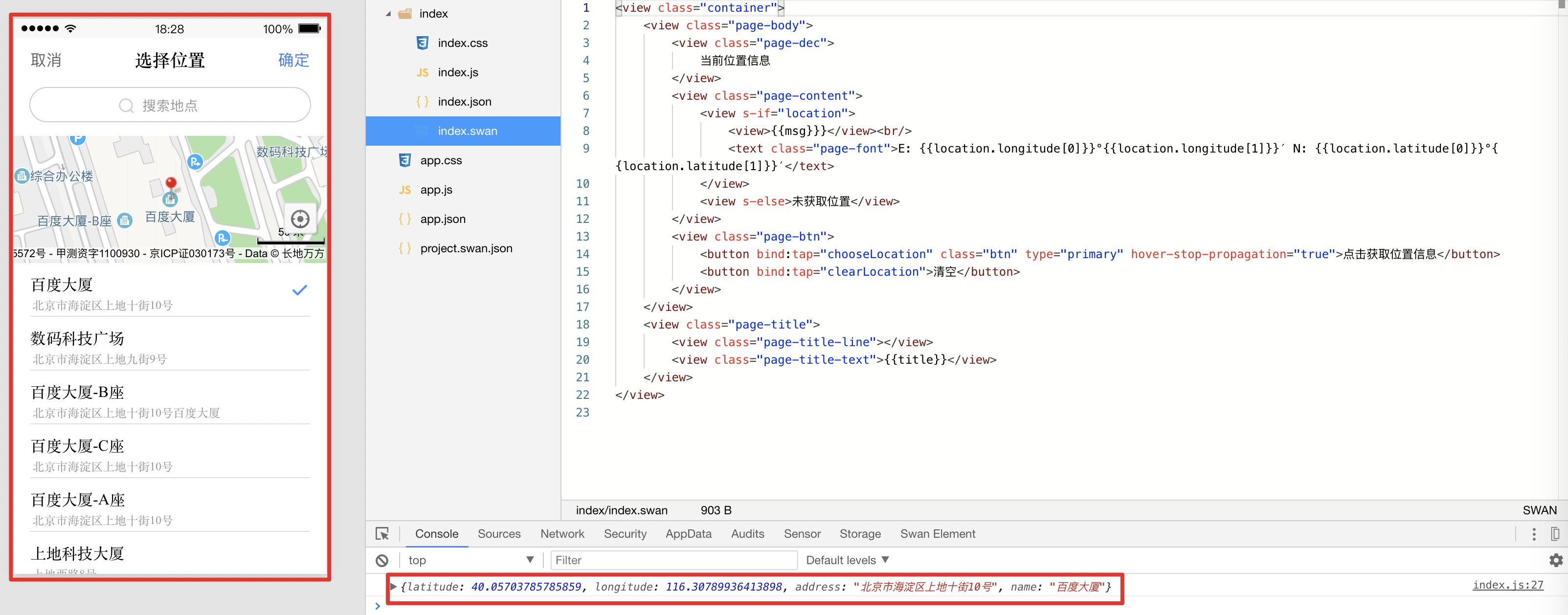 - 推荐使用 swan.chooseLocation 可获取到选择当前位置的经纬度。在开发者工具中调用 swan.chooseLocation 用日志输出看到经纬度(坐标系 GCJ02 ,可以直接用于小程序),具体方法可参考官方示例在开发者工具中预览效果。