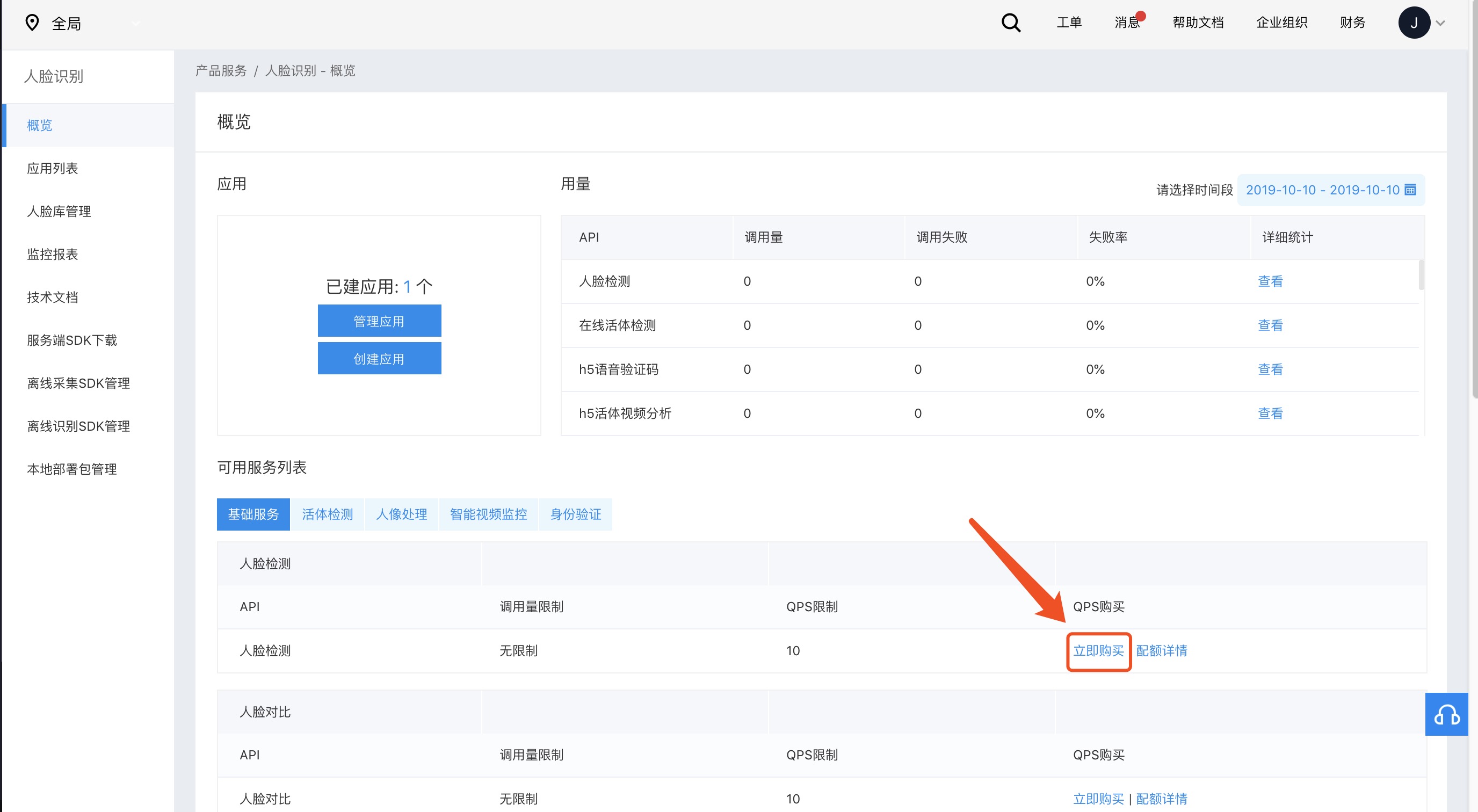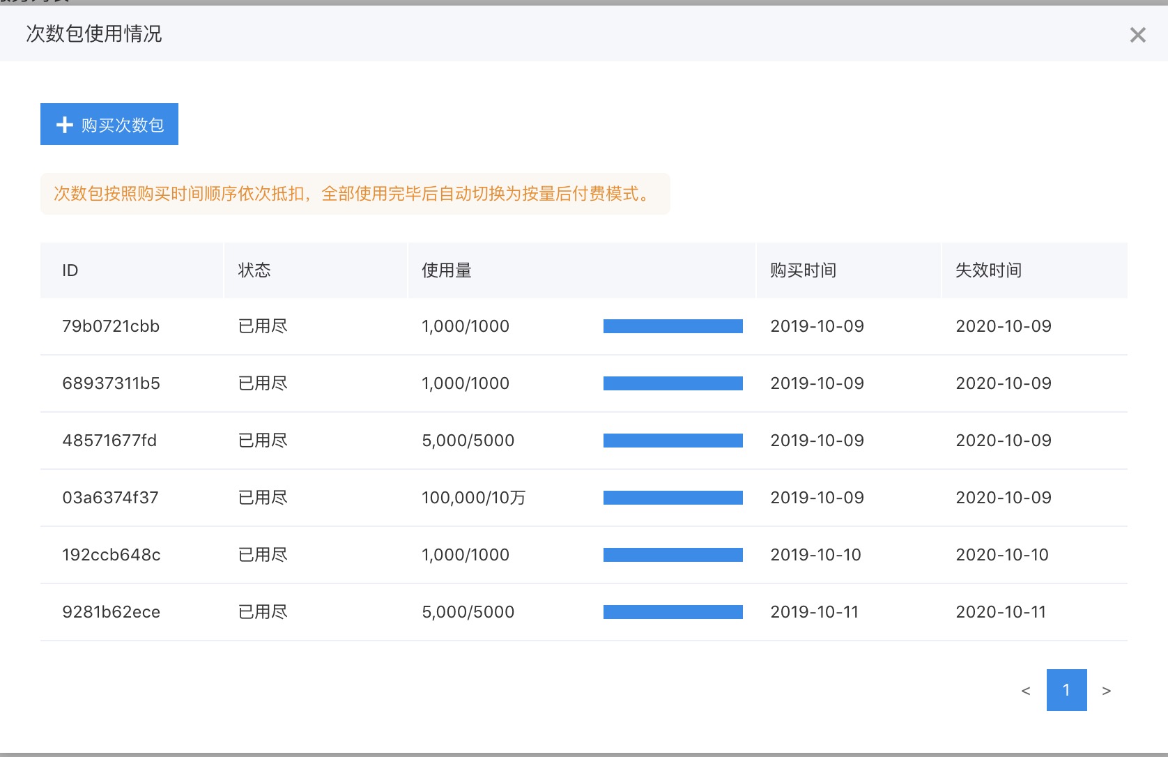 - 购买次数包后,可以在人脸识别控制台查看次数包使用详情。