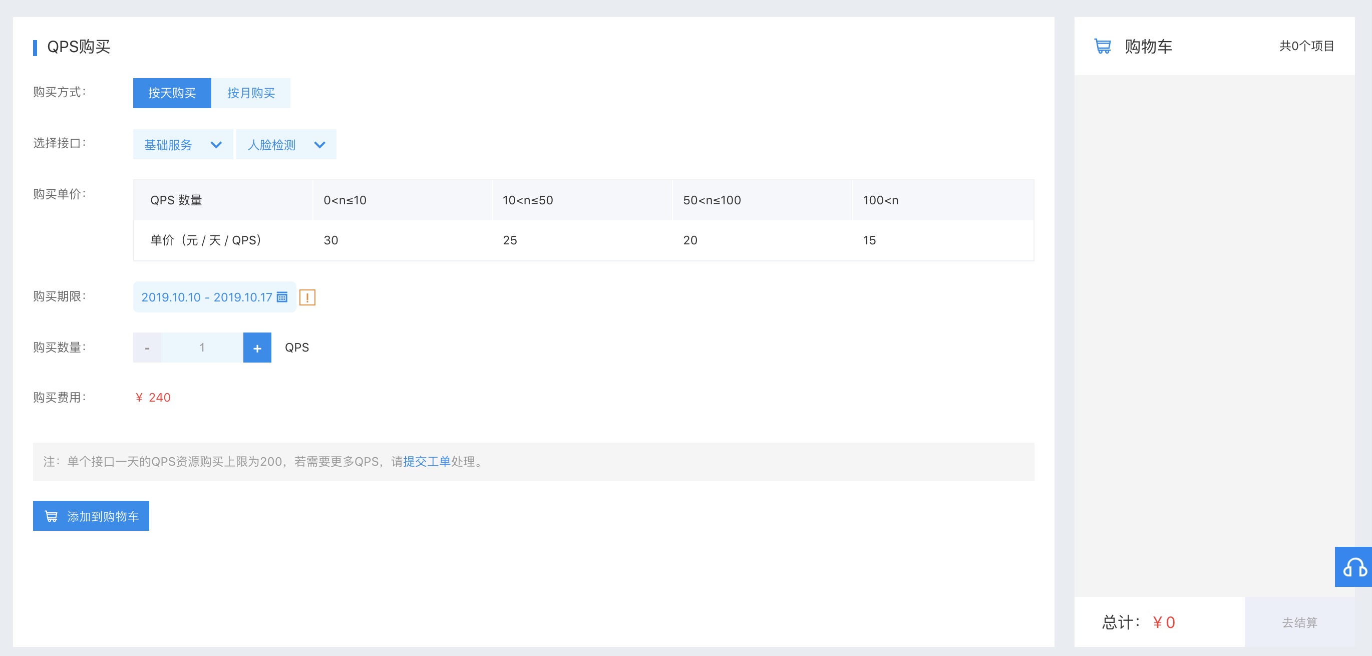 - 选择购买方式、接口、购买期限、购买数量,添加至购物车并进行结算。注意:由于购买 QPS 需要预留机器资源 购买后不支持退款。购买时请确认接口、期限、数量等信息无误