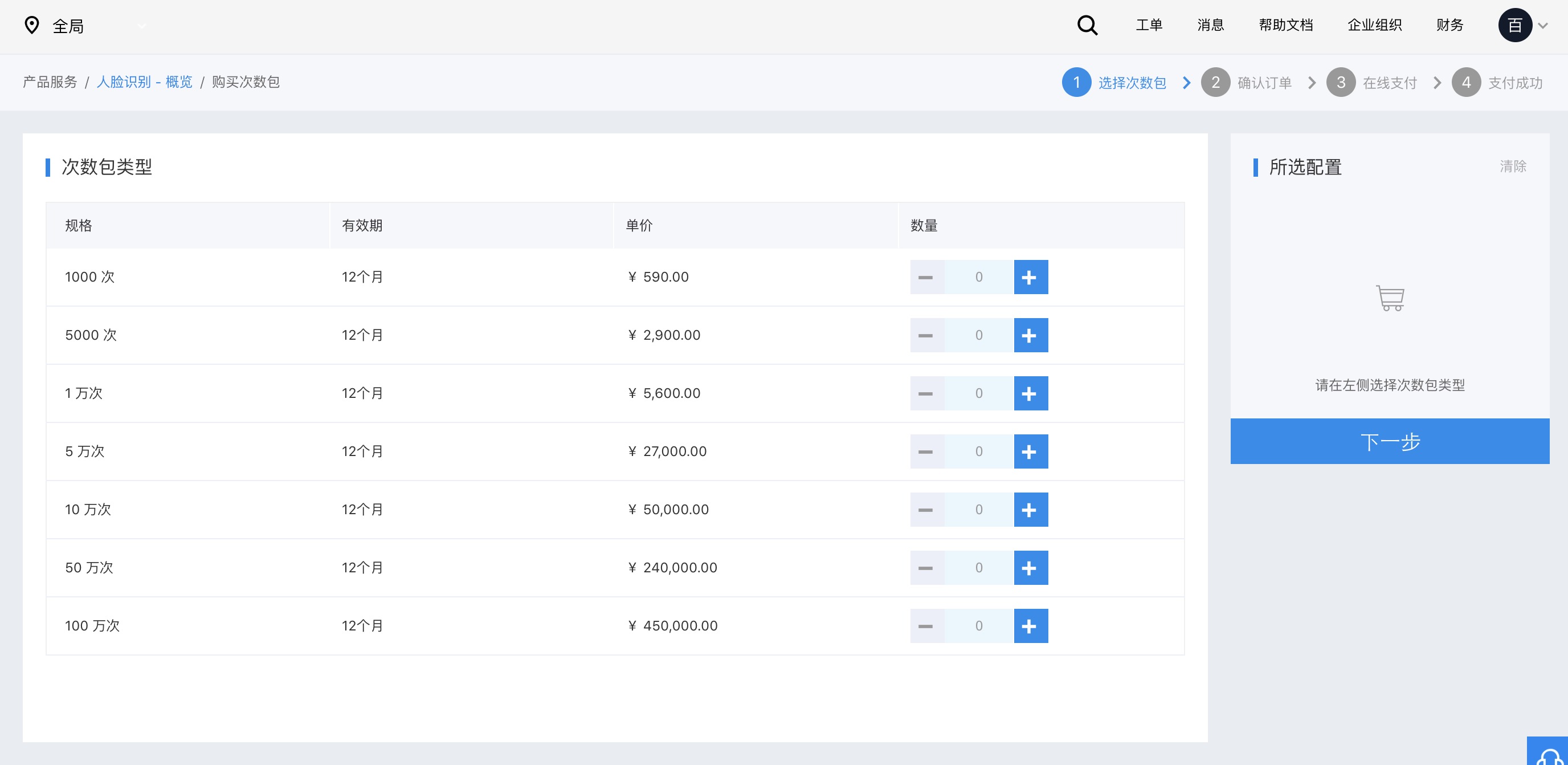 - 选择购买的次数包与购买数量,添加至购物车并进行结算。