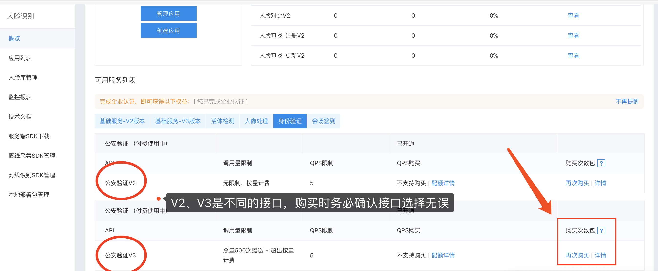 - 选择服务,如图位置点击 "购买",进入购买页面。注意:V2、V3是不同的接口,购买时请确认选择的接口无误
