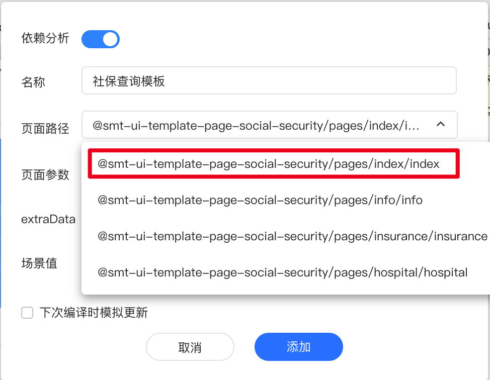 { "pages": [ ... "pages/@smt-ui-template-page-social-security/pages/index/index", "pages/@smt-ui-template-page-social-security/pages/info/info", "pages/@smt-ui-template-page-social-security/pages/insurance/insurance", "pages/@smt-ui-template-page-social-security/pages/hospital/hospital" ... ] } - 为了方便在开发者工具中查看模板页的效果,可以设置模板页为小程序预览的首页。详情请见自定义编译文档。
