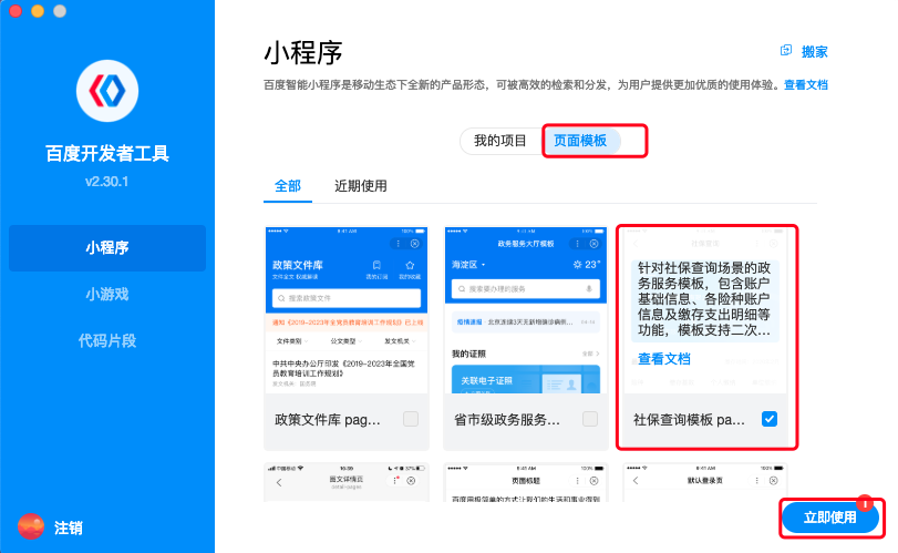 - 打开开发者工具,点击 ”页面模板“,在下方找到 ”社保查询模板“,选中该模板后点击右下角 ”立即使用”,填写相关信息点击右下角 ”完成“ 按钮。