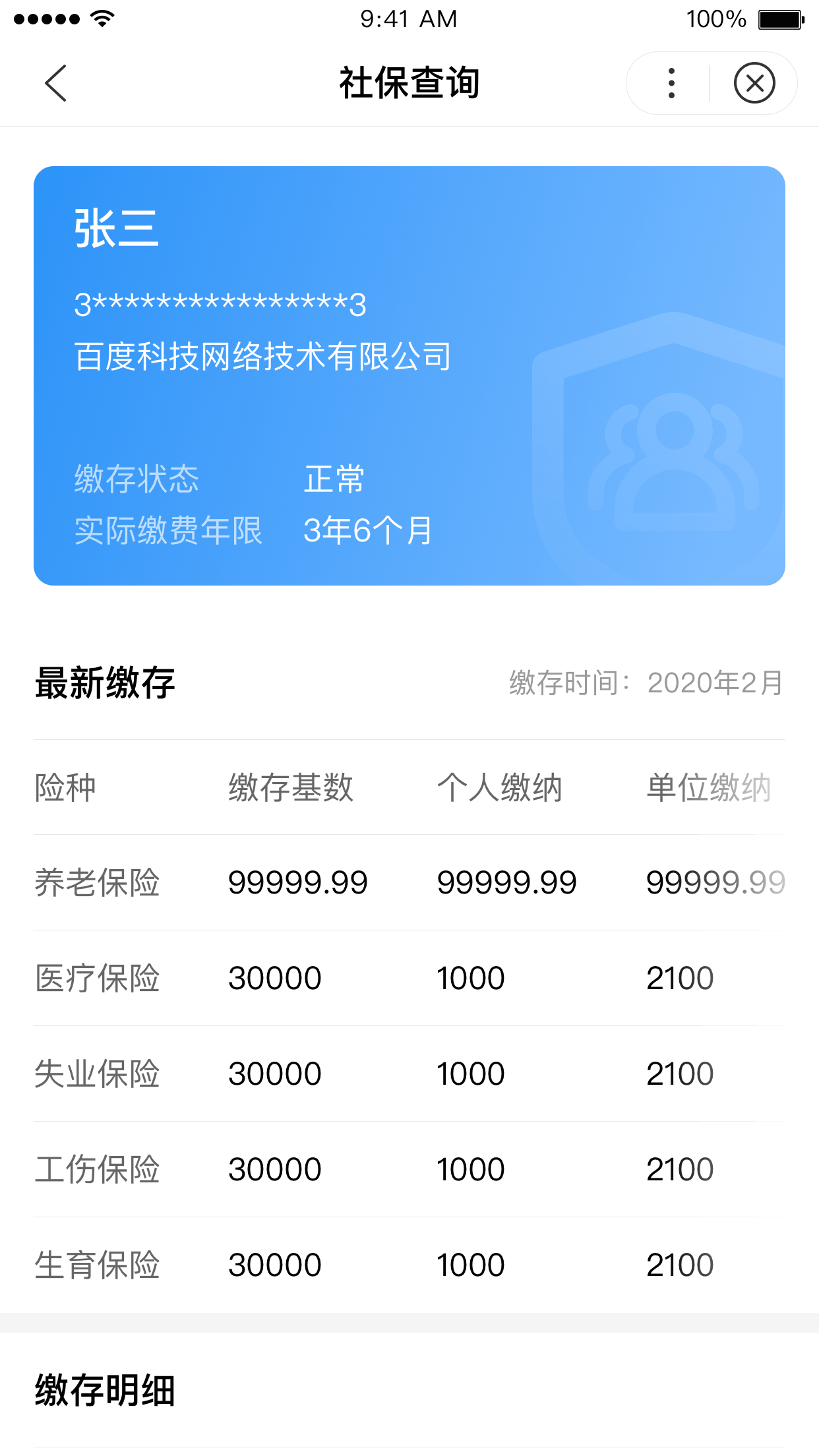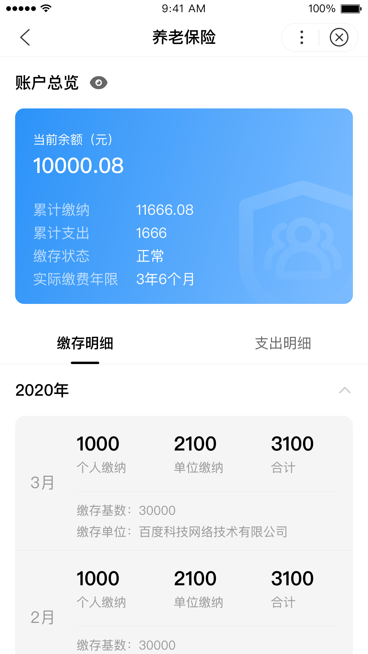 展示用户某一险种的具体信息,包含账户基础信息、全部历史缴存记录、全部历史支出记录等。