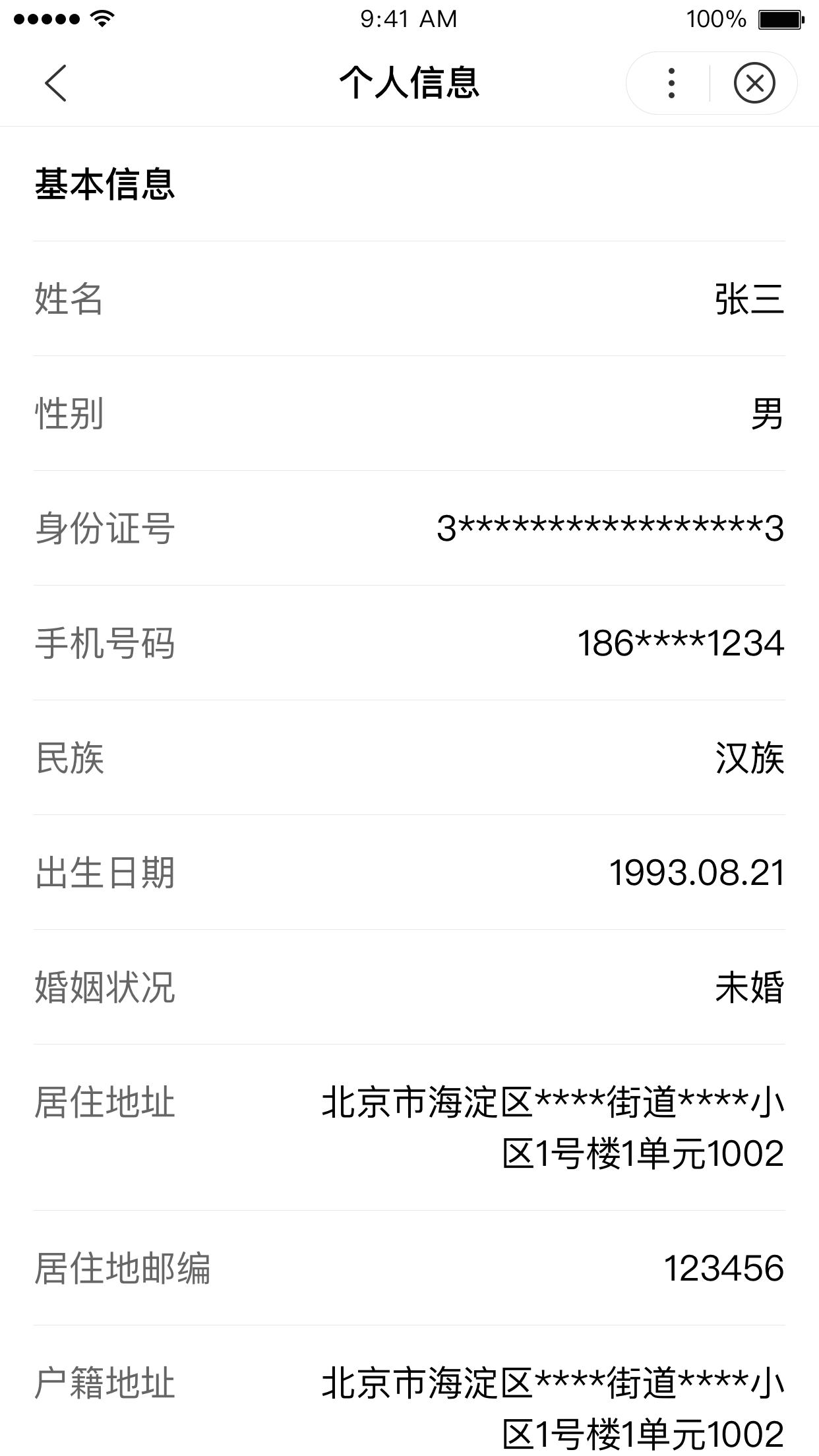 展示用户的基础信息和社保相关信息,如社保卡号、参保地、参保单位等。