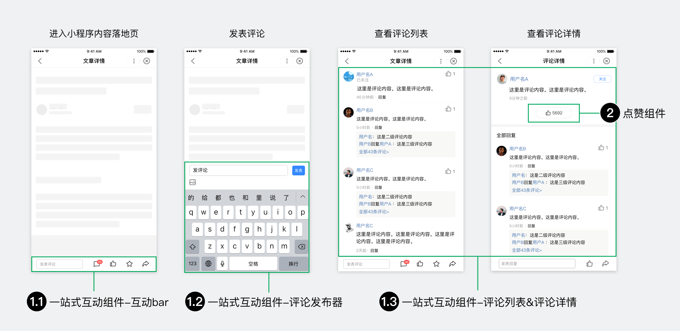 - 面向希望快速搭建整套互动体系的开发者,小程序官方提供 一站式互动组件,包含互动bar(图示 1.1)、评论发表(图示 1.2)、评论列表&评论详情落地页(图示 1.3)以及数据存储能力,开发者可整体低成本快速接入。