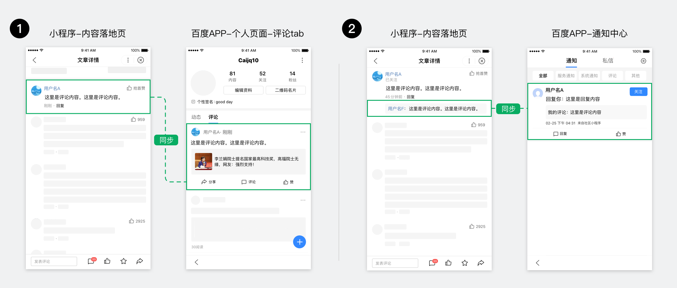 小程序接入官方互动能力示例:小程序接入一站式评论组件组件提供的百度 APP 消息通知服务后,小程序内发生的评论互动可同步至百度 APP 个人页面及通知中心。