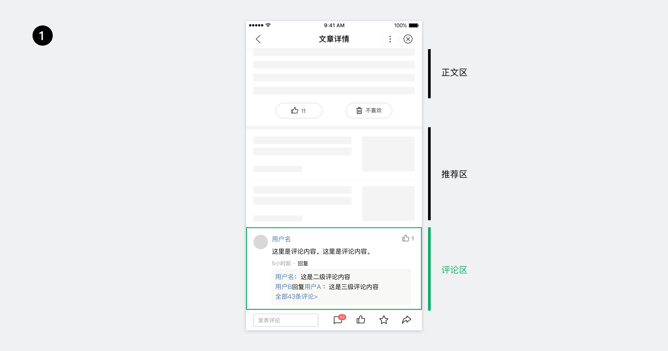 - 评论内容区:建议按”正文区-推荐区-评论区“顺序布局,便于用户阅读推荐内容。