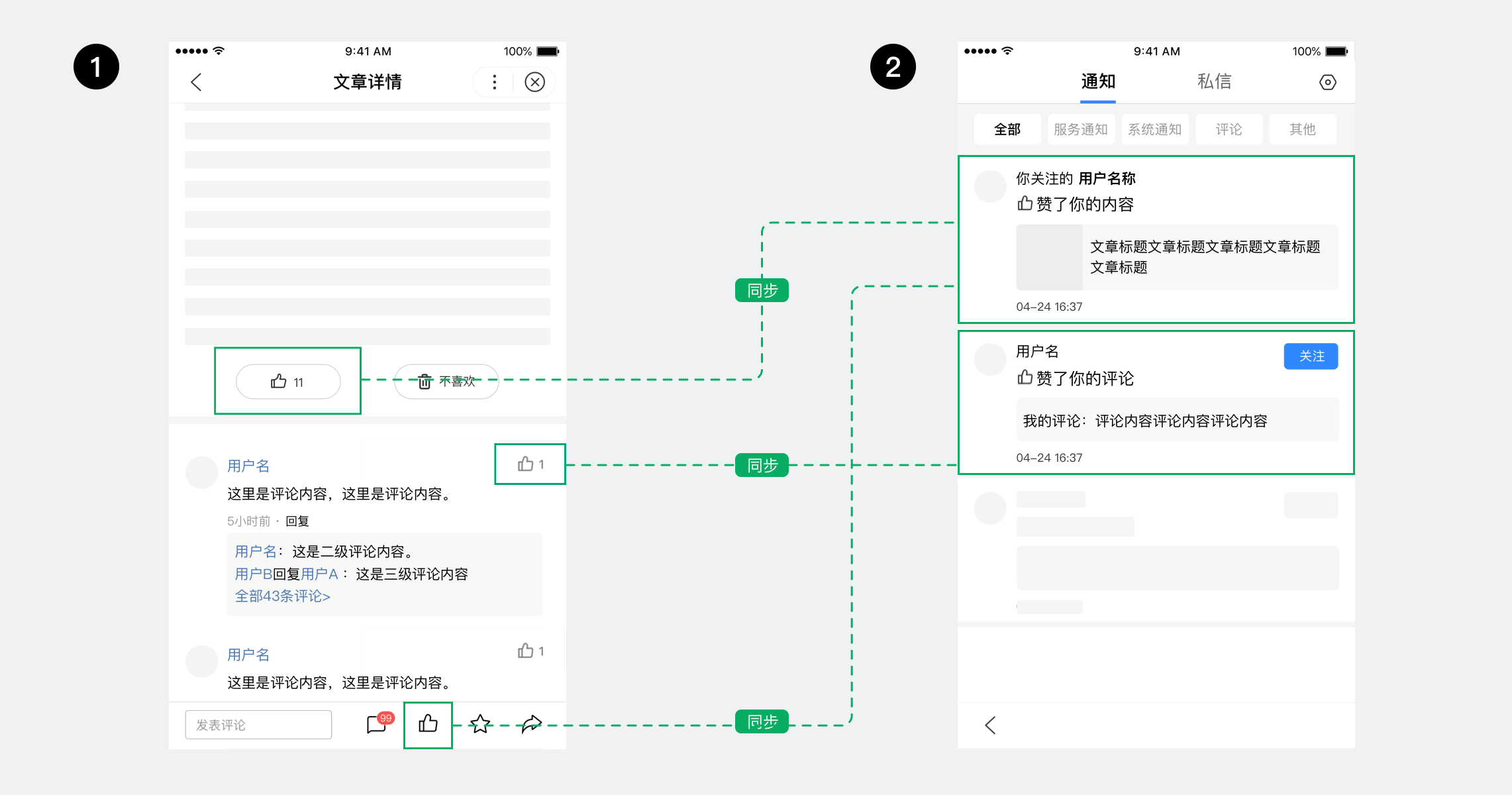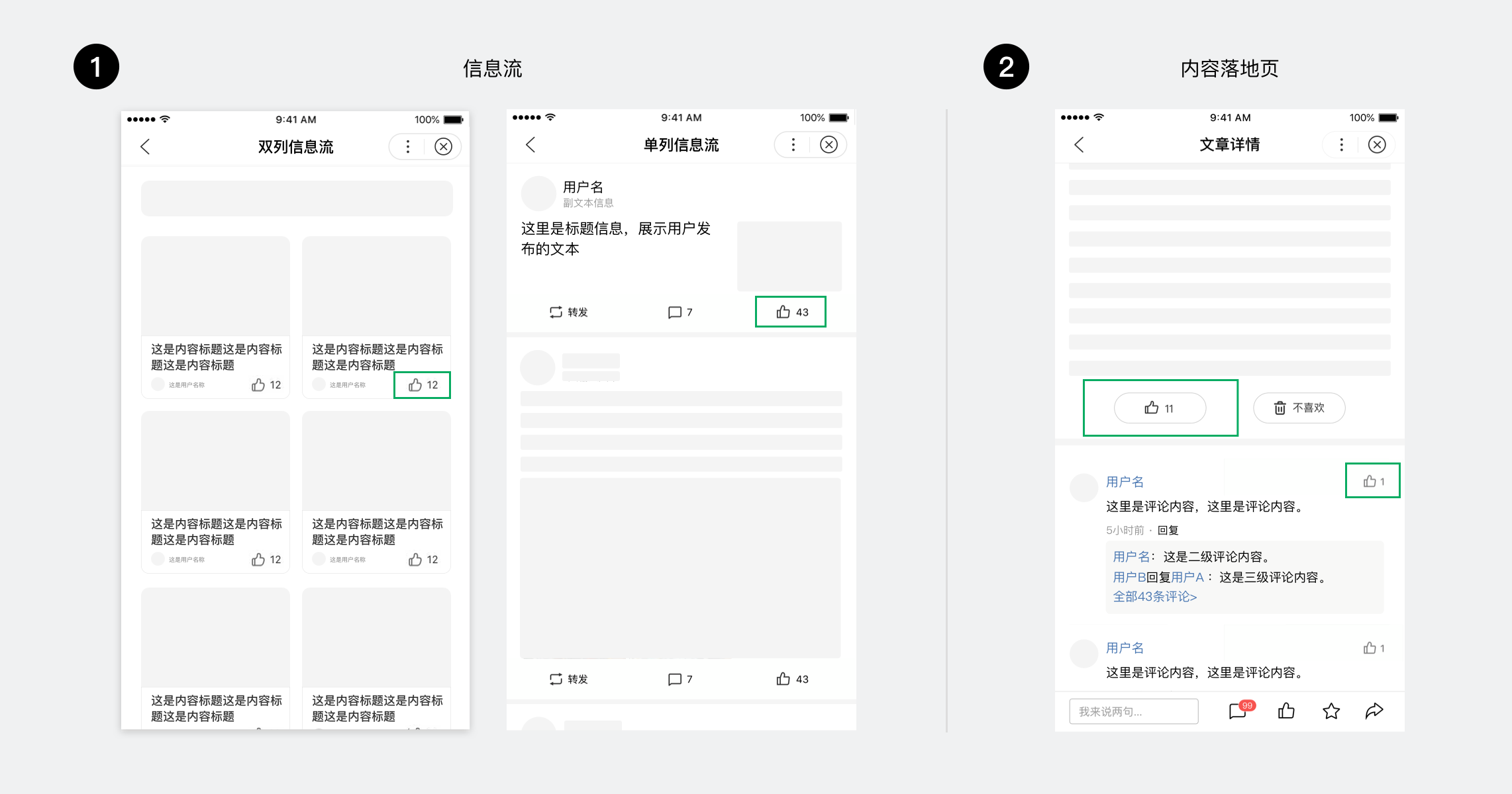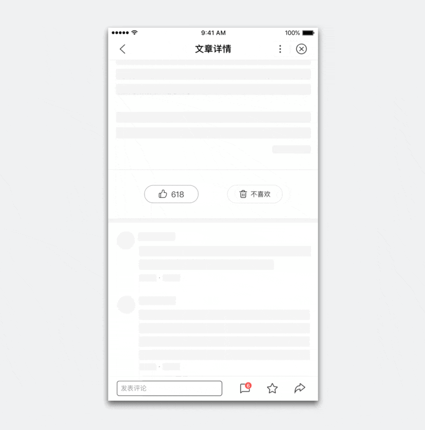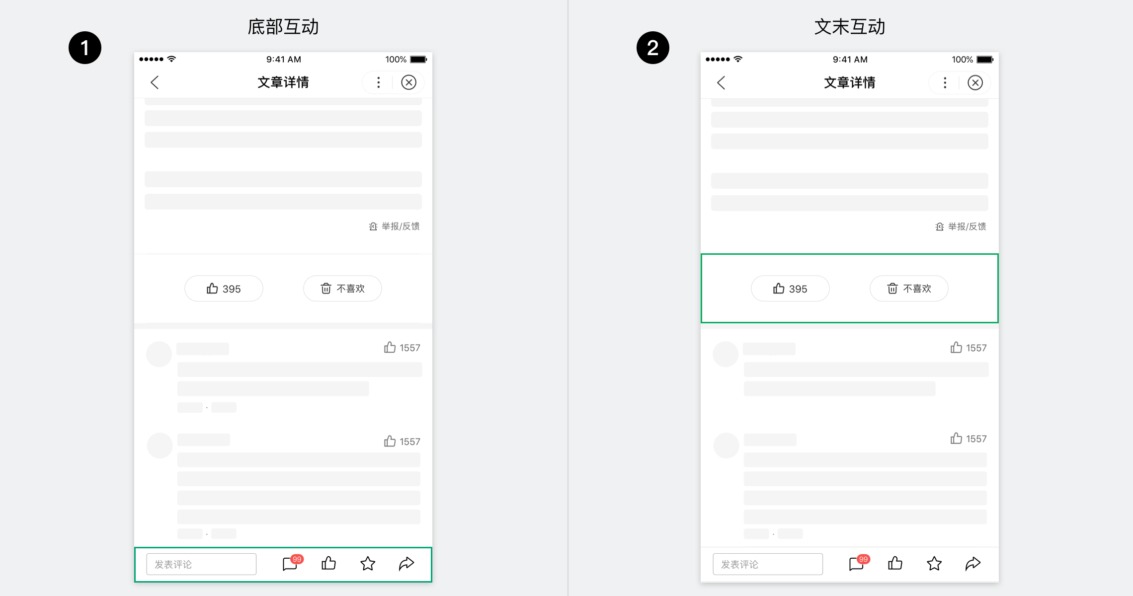 - 文末互动:承载用户好恶表达功能(点赞、喜欢/不喜欢),便于用户在文章浏览完毕时的快捷发表观点。