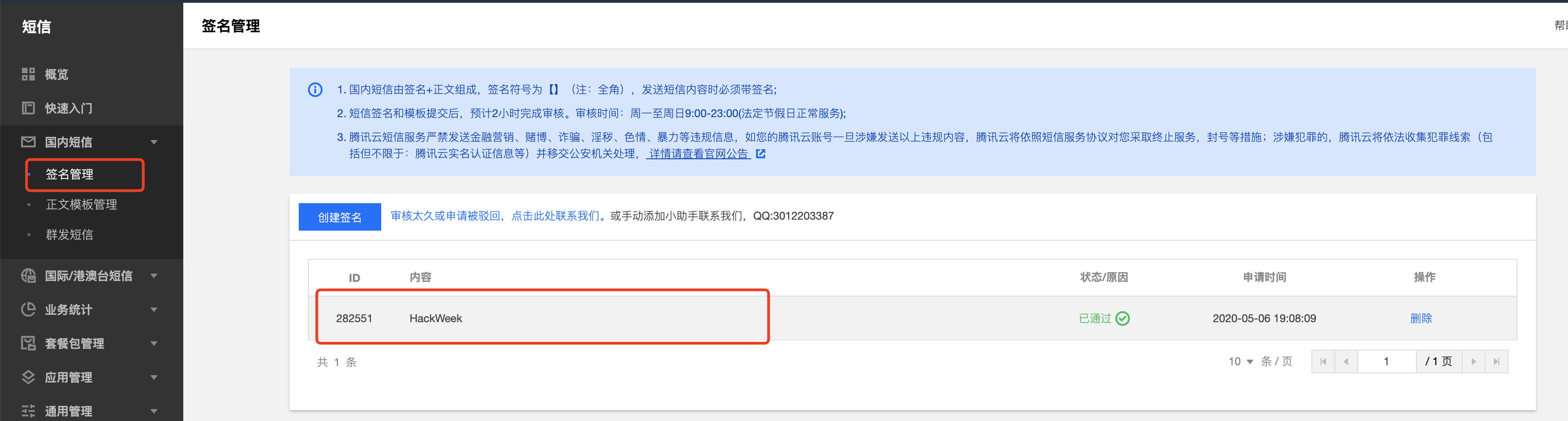 打开左侧菜单里的国内短信-签名管理,点击创建签名,创建完签名后,这个签名内容之后会用到。