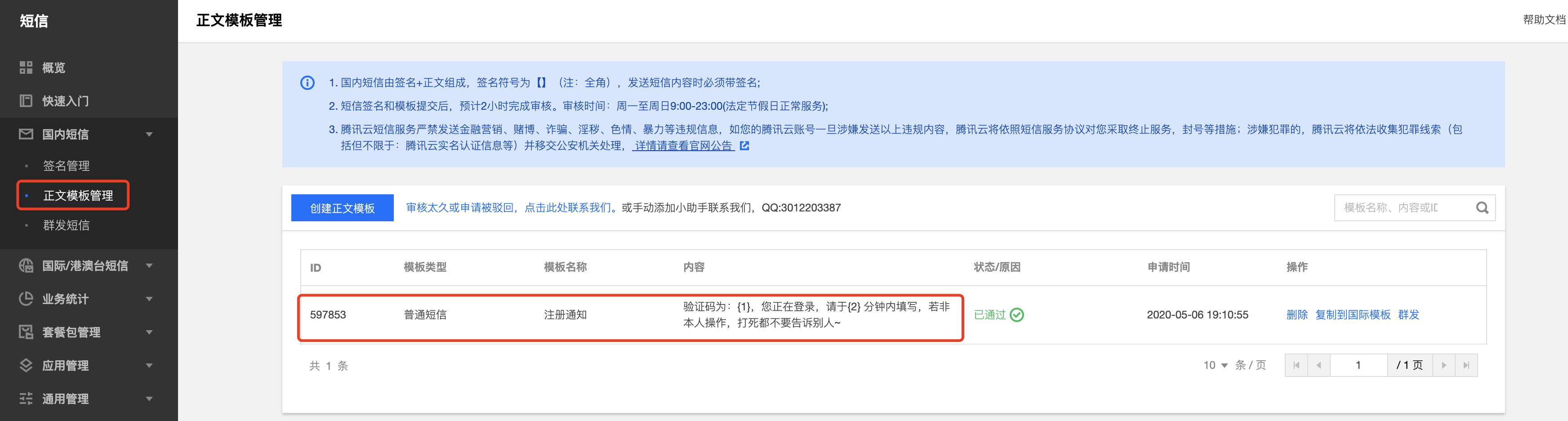 打开左侧菜单里的国内短信-正文模板管理,点击创建正文模板,创建完模板后,会有一个模板ID,这个之后会用到,也要记住你模板的变量位置。