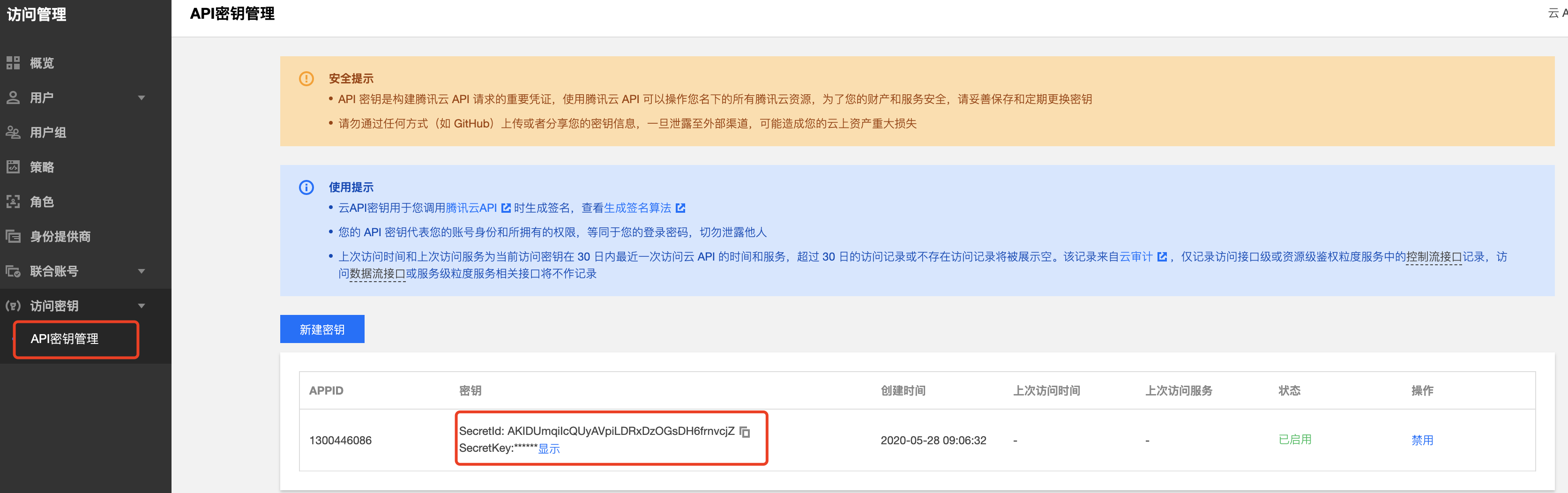 在使用云API之前,用户首先需要在腾讯云控制台上申请安全凭证(API密钥),安全凭证包括 SecretID 和 SecretKey。打开腾讯云访问密钥的API密钥管理,点击新建密钥,就可以创建密钥了,创建之后,就可以看到 SecretID和SecretKey,这两个之后会用到。