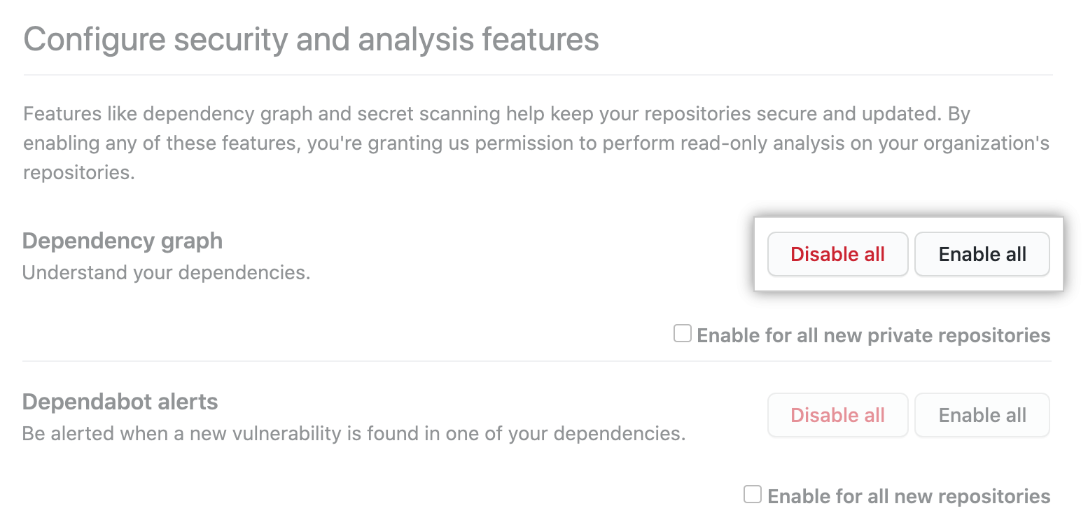 - 在功能右侧的“Configure security and analysis features(配置安全和分析功能)”下,默认对组织中的新仓库启用或禁用该功能。