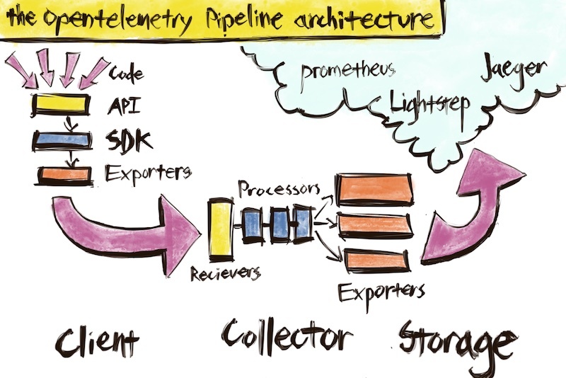 我们先看看OpenTelemetry的架构图,我们这里不会完整介绍,只会介绍其中大家常用的几个概念。关于OpenTelemetry的内部技术架构设计介绍,可以参考 OpenTelemetry架构 ,关于语义约定请参考:https://github.com/open-telemetry/opentelemetry-specification/blob/main/specification/trace/api.md