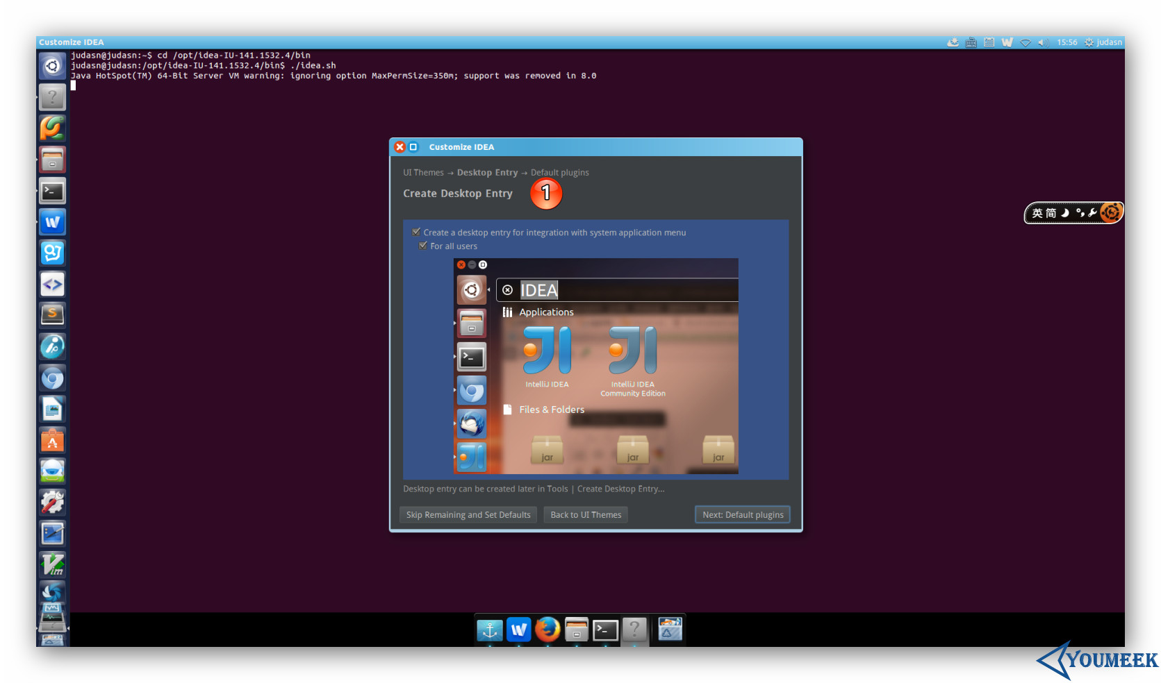 Ubuntu 下安装过程其中,在整个首次启动的配置过程中,唯一跟 Windows 不太一样的就是上图标注 1 这个地方。原因是 Linux 下创建启动图标是非常非常非常的麻烦,所以 IntelliJ IDEA 帮我们考虑到了,所以只要勾选下即可解决这种麻烦事。