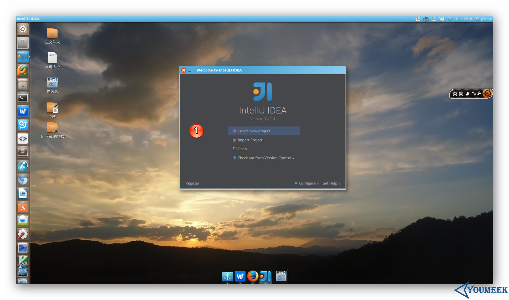 在假设你已经通过终端切换到了你常用的用户下之后,现在用终端进入解压目录下的 bin子目录 下,然后在终端下运行启动命令:./idea.sh,运行的效果如上图箭头所示。剩下的配置步骤就跟 Windows 基本一样了,如标注 1 所示,所以这里不多讲。