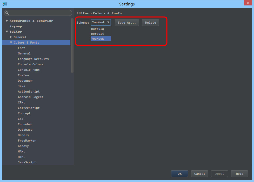 编辑区主题,也就是代码书写区的主题修改。基本上大家在 General上都有对此进行小修小改,我下面也主要介绍下我个人在 General上常修改的一些地方,其他特性的颜色修改我一般默认,但是修改方法原理一样。如上图红圈下拉所示,展示的是我当前电脑可以选择的编辑区主题。 对于编辑区的主题,也有人制作成模板在网络上提供下载。这里主要介绍两个站点: http://color-themes.com/?view=index,主要提供 jar文件下载。http://www.phpstorm-themes.com/,主要提供 xml和 icl文件下载。对应文件如何安装请查看网站对应的 Help页面,都有详细说明的。
