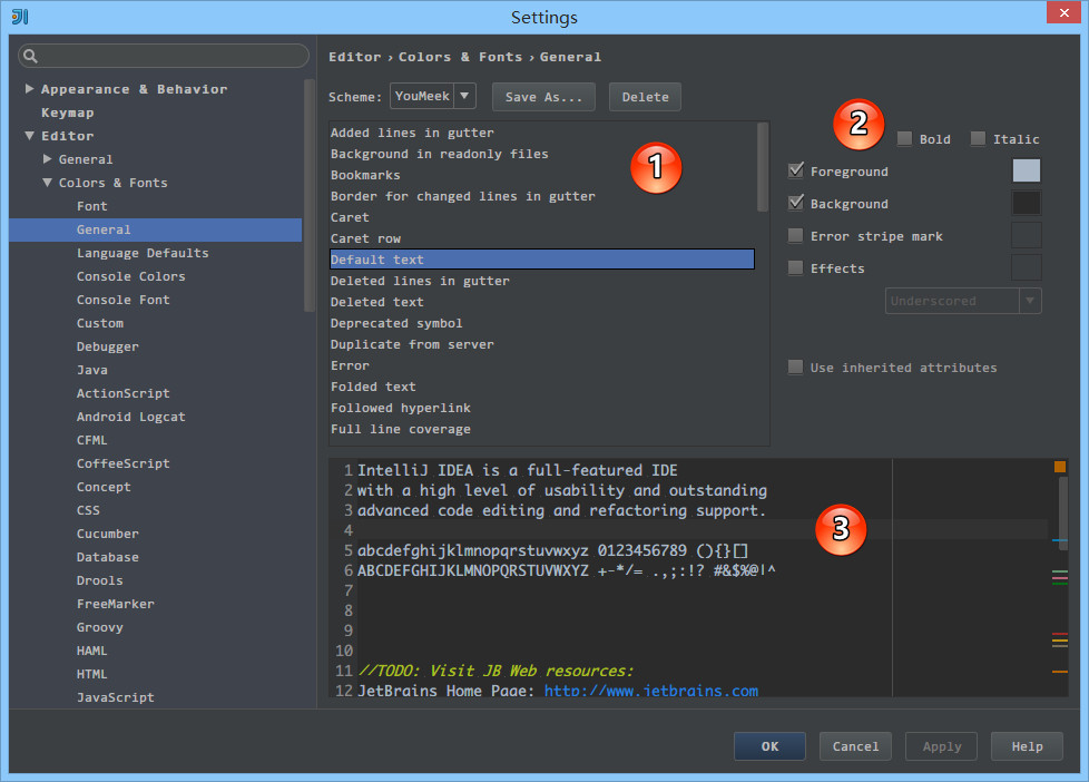 Default text 是可以勾选 Bold,而 Caret row 则是无法勾选 Bold,因为只有文本才有加粗的属性需求。- 上图标注 3 为修改后的预览区,预览区是实时动态展示的。