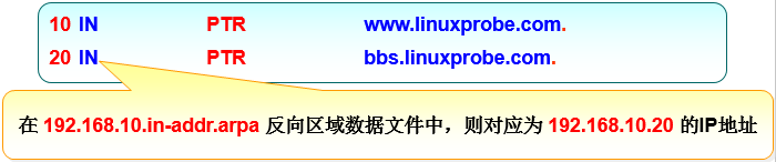 10 PTR ns.linuxprobe.com. #PTR为指针记录,仅用于反向解析中。