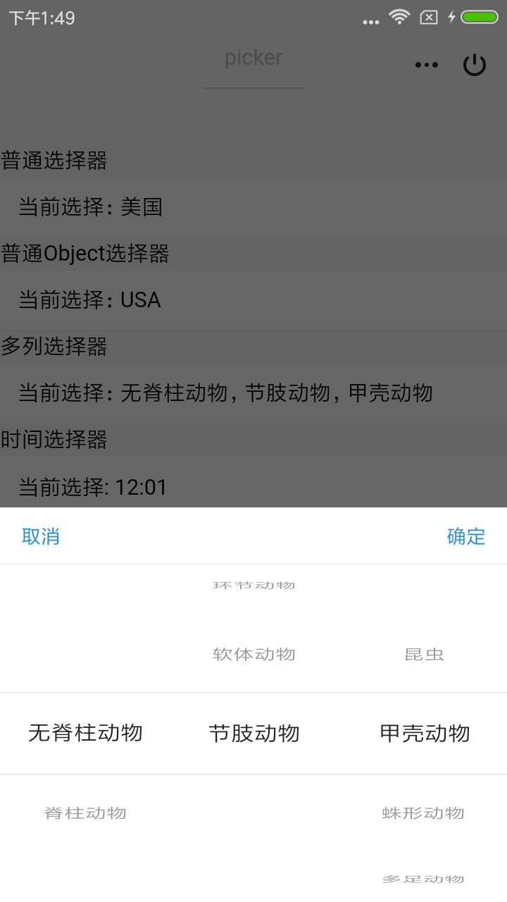 从底部弹起的滚动选择器,现支持五种选择器,通过 mode 属性来设置,分别是 普通选择器,多列选择器,时间选择器,日期选择器,省市区选择器,默认是 普通选择器。