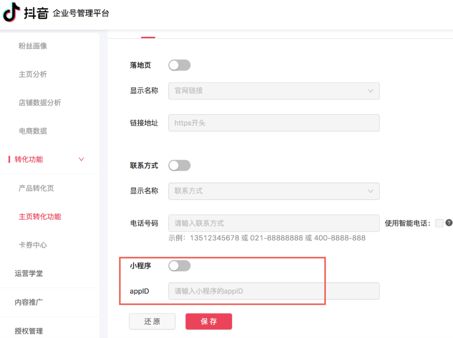 - 进入企业号管理后台,点击进入转化功能->主页转化功能;
