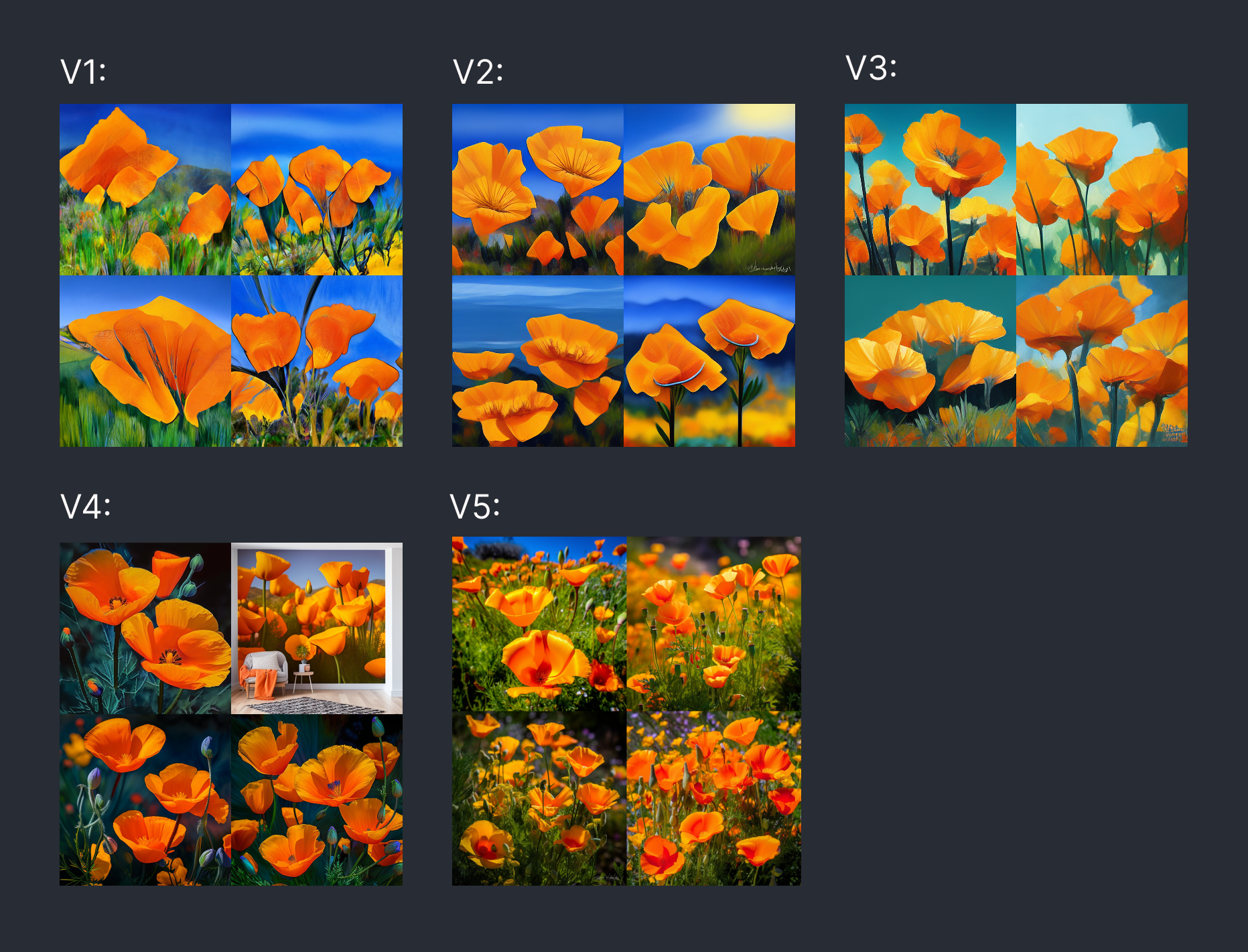 vibrant california poppies --v 5 | 版本仅支持 1、2、3、4、5。 |