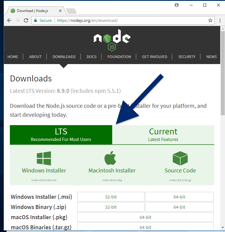 如果你使用的是 OS X 或 Windows,请使用Node.js 下载页面中的安装程序之一。请务必安装标有LTS的版本。其他版本尚未使用 npm 进行测试。
