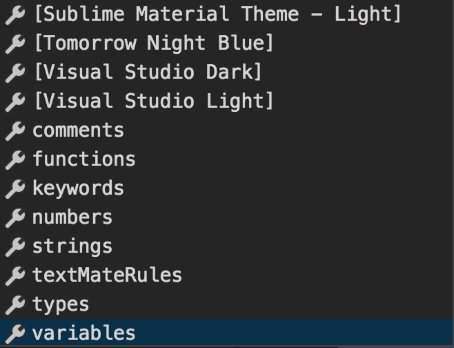 建议列表中首先出现的,就是你可以在 VS Code 中使用的所有的主题的名字。通过选择它们,你可以只覆盖某个主题中的某个颜色。这里你可以滚动这个列表,看看下面还有别的什么建议。