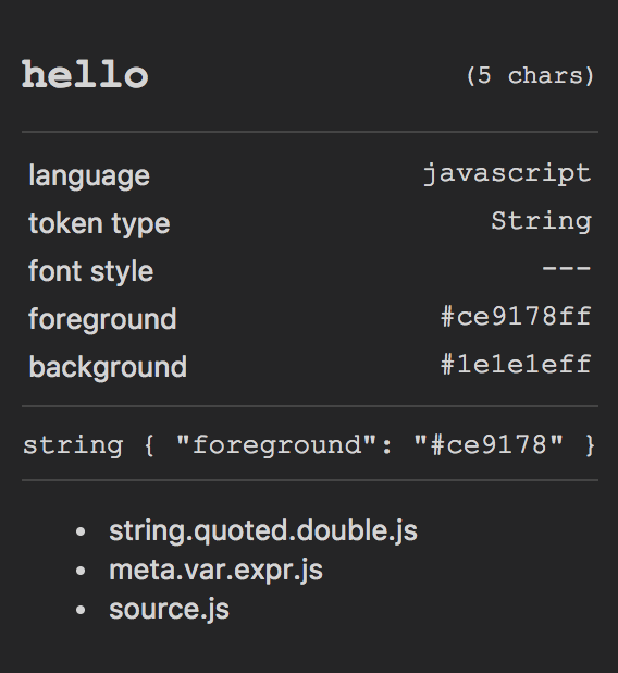 在这个窗口的最下方,就是 TextMate 的语法规则作用域了。hello 这个词所处的 TextMate 语法作用域由内而外分别是 string.quoted.double.js,meta.var.expr.js,source.js。VS Code 的主题插件在配置编辑器内代码的颜色时,就是针对这些作用域进行设置的。而你要修改某个作用域所对应的颜色,就是在设置中修改 textMateRules 。
