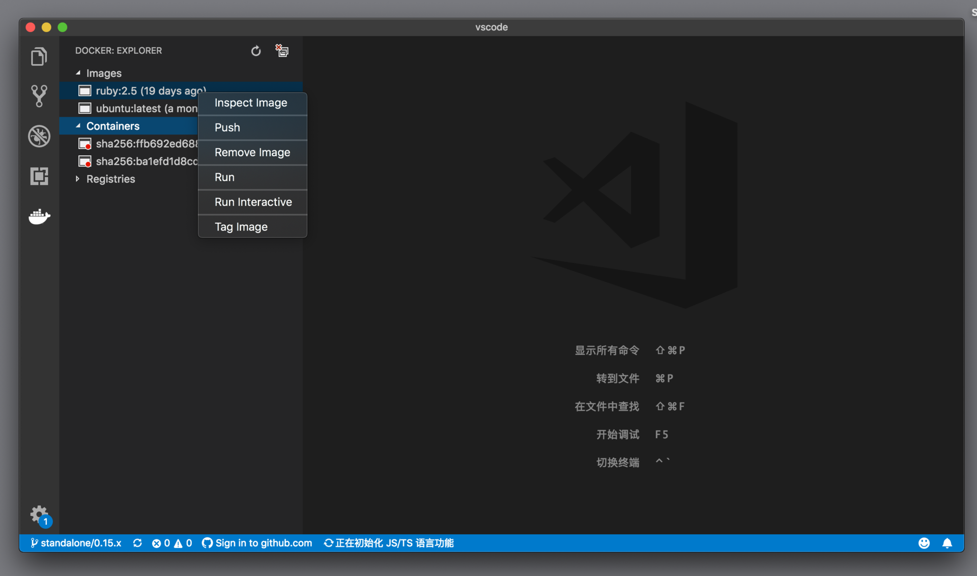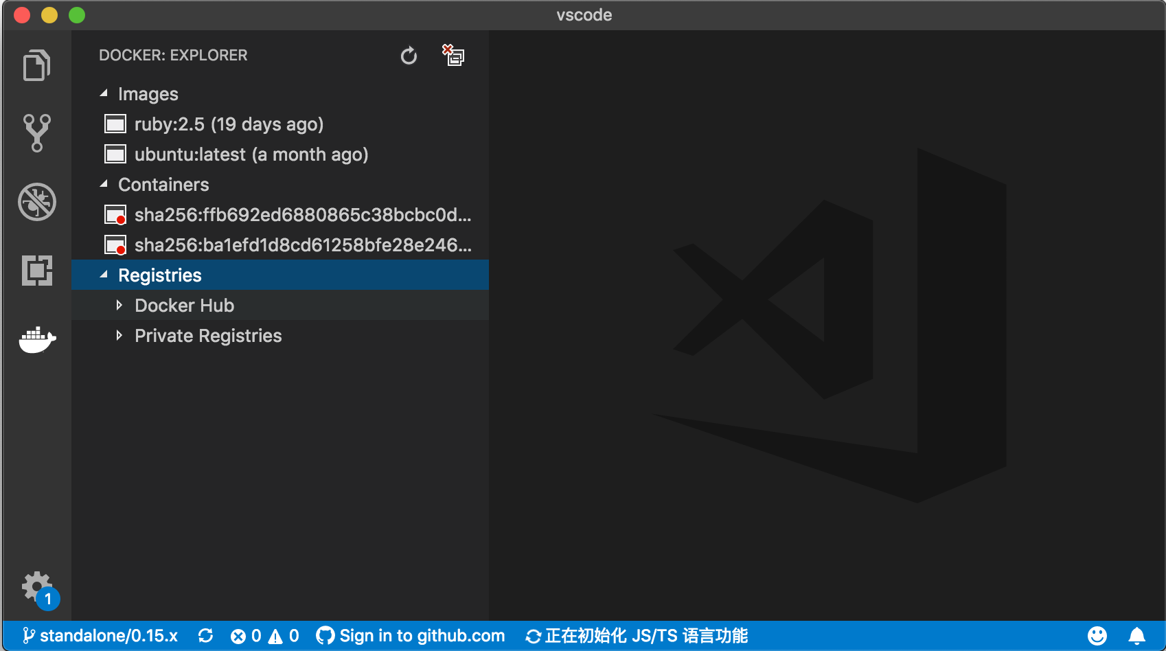 安装完Docker插件后,在活动栏上,我们就能够看到一个集装箱的图标,点击它,我们就能够看到 Docker 相关的信息了。