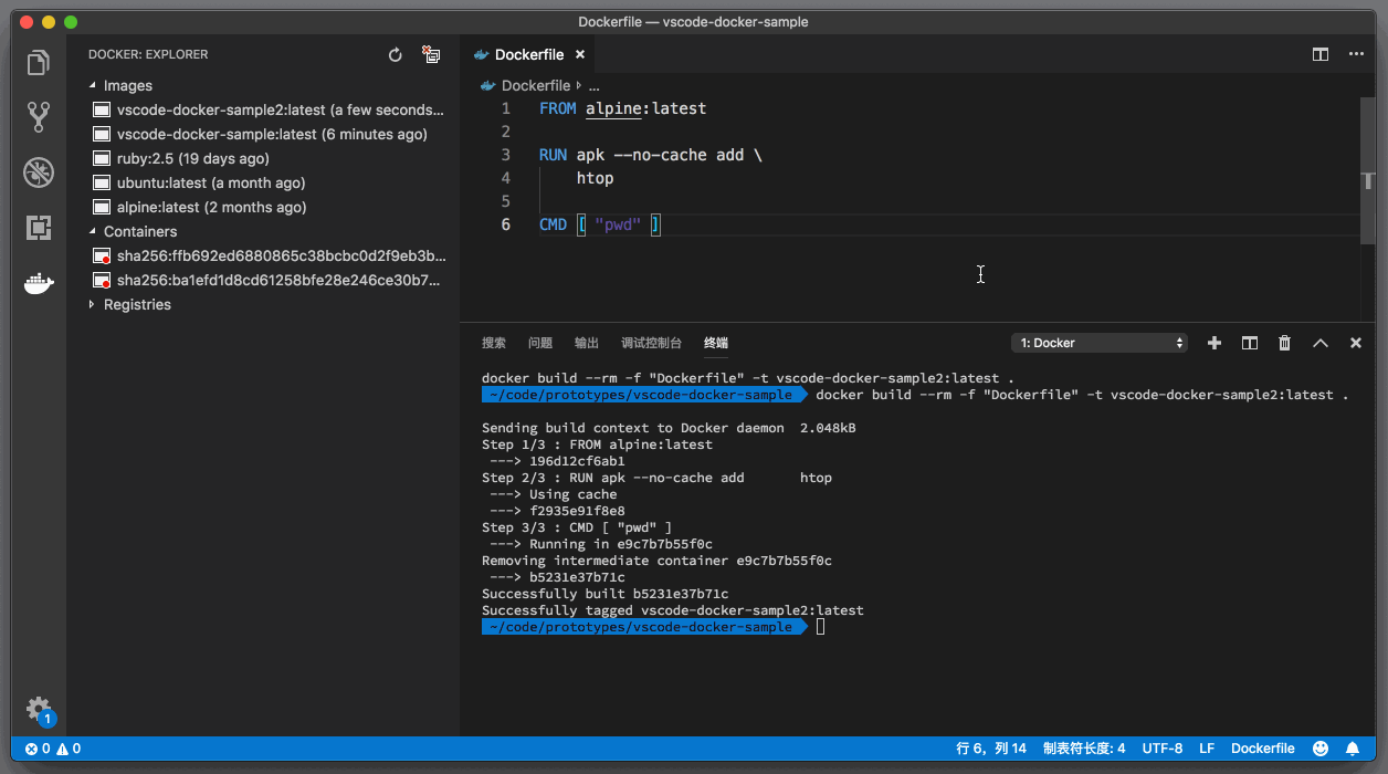 修改完 Dockerfile 之后,第一件要做的事情,就是重新构建 image。在构建这个 image 时,我们可以覆盖之前的那个 image,也可以重新起个名字来创建一个新的 image。比如我就给新的 image 取名为”vscode-docker-sample2:latest”。