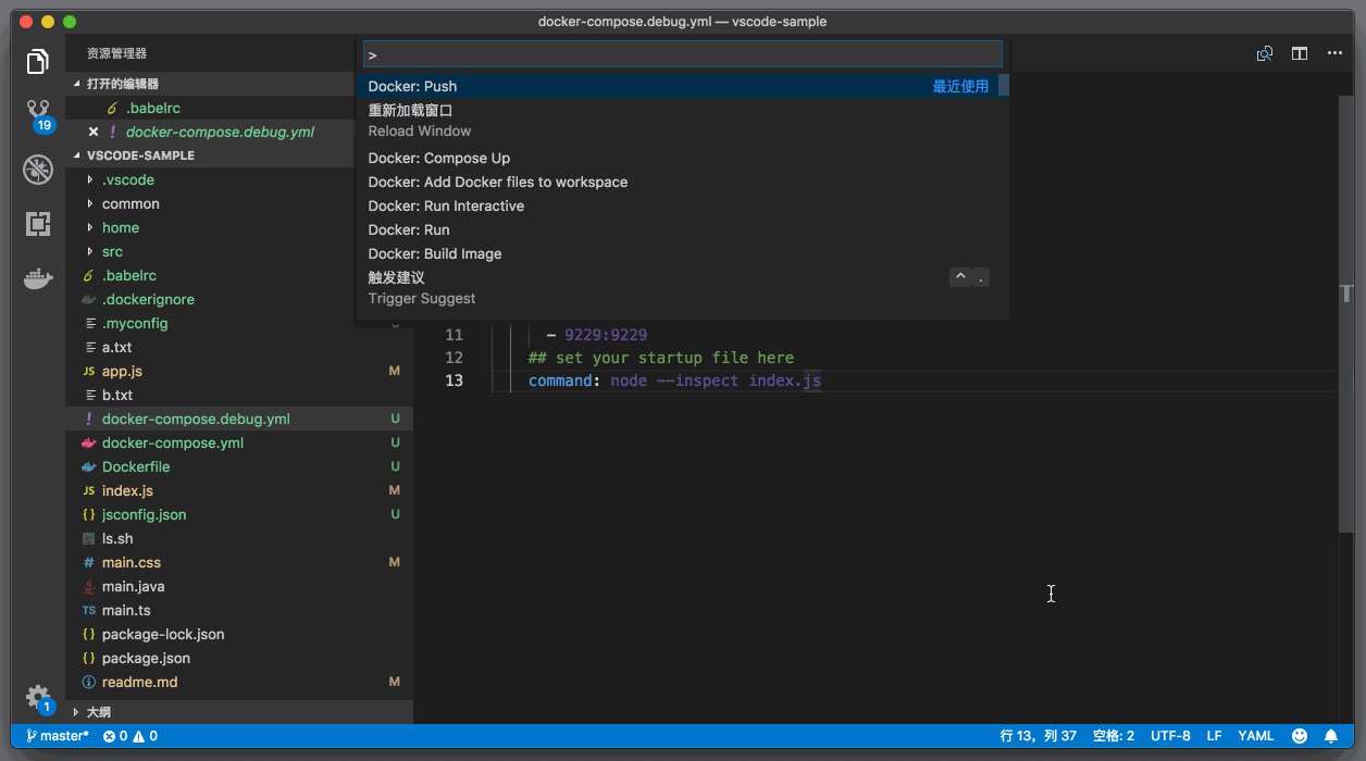 - command: node –inspect index.js ,在 container 运行起来后,运行 node 程序,并且调试 index.js 文件。
