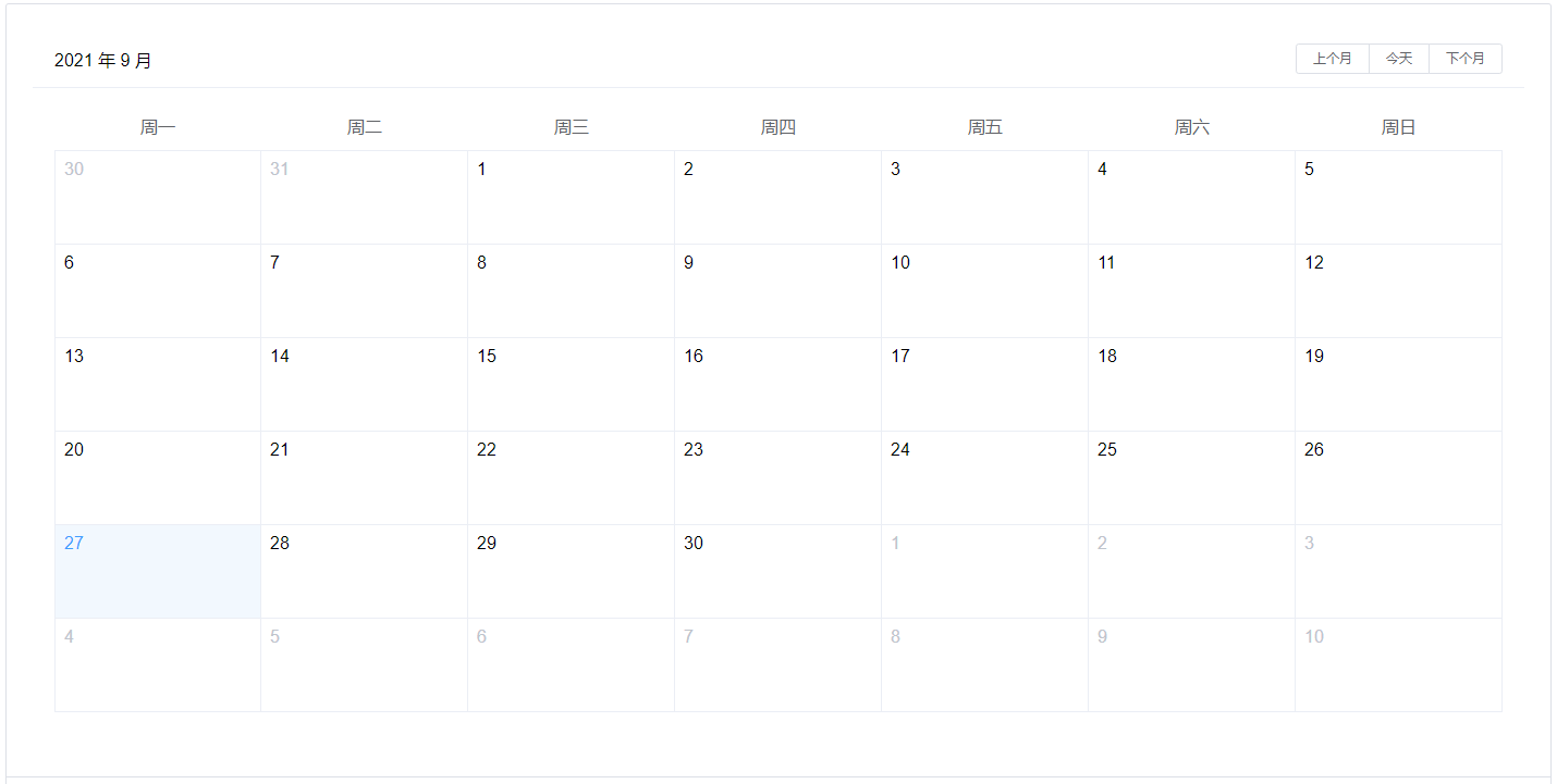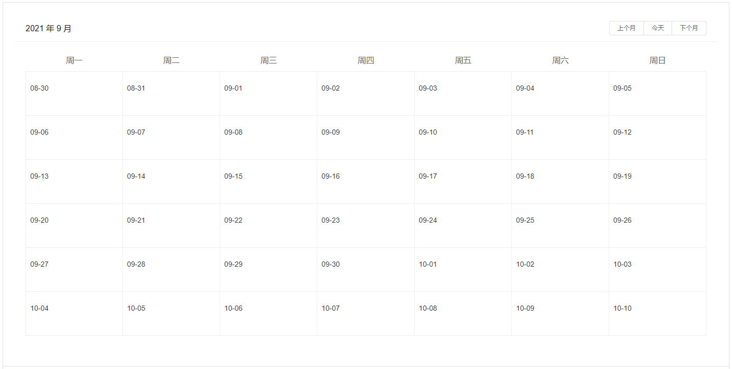 设置 range 属性指定日历的显示范围。开始时间必须是周起始日,结束时间必须是周结束日,且时间跨度不能超过两个月。