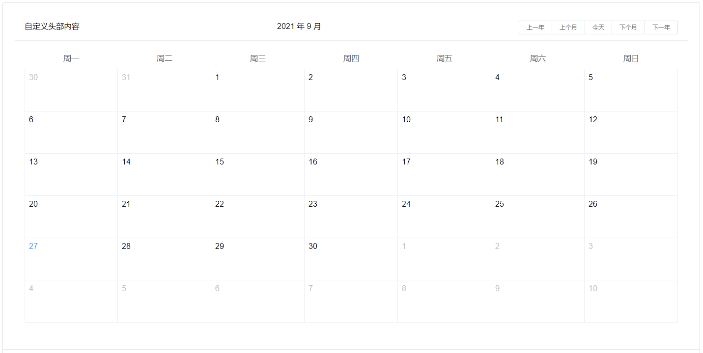 通过设置名为 header 的 scoped-slot 来自定义日历头部显示的内容。在 scoped-slot 可以获取到 date(当前单元格的日期)。详情解释参考下方的 API 文档。