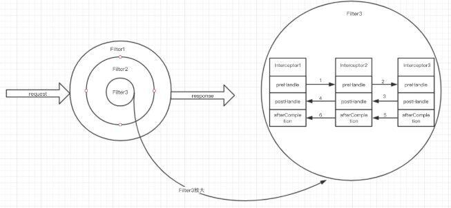 过滤器的执行顺序首先跟在 web.xml 中配置的顺序有关,先配置的先执行,但是并不是说是等上一个过滤器执行结束了再执行下一个,它们之间是通过链来执行的,具体的过滤器和拦截器的执行过程我画了个图,可以看下。