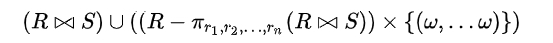 - 左外连接 (⟕) :左外连接写成R ⟕ S,其中R与S为关系。左外连接的结果包含R中所有元组,对每个元组,若在S中有在公共属性名字上相等的元组,则正常连接,若在S中没有在公共属性名字上相等的元组,则依旧保留此元组,并将对应其他列设为NULL。